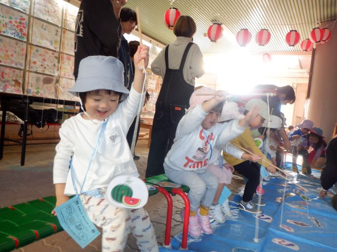 お神輿や獅子舞いのほか、魚釣り、的あて、風船運びなど